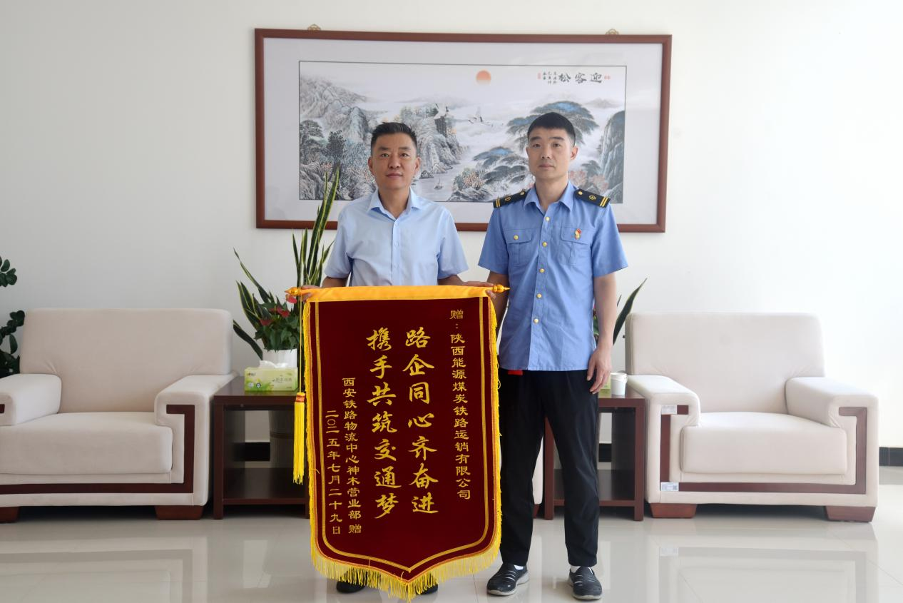 7月30日上午,西安鐵路物流中心神木營業(yè)部主任宋黎明將一面印有“路企同心齊奮進(jìn),攜手共筑交通夢”的錦旗鄭重交到鐵路運銷公司董事長手中,真摯感謝鐵路運銷公司在鐵路線路出現(xiàn)險情的危急關(guān)頭能夠鼎力馳援,助力鐵路線路高效搶通。