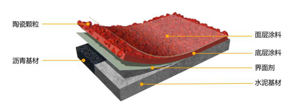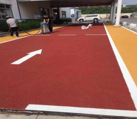 施工工藝: A.鋪裝于水泥或?yàn)r青路面基礎(chǔ) B.吹風(fēng)機(jī)或掃把清理基礎(chǔ)道路 C.滾涂底涂(瀝青路面不需要) D.刮涂攪拌均勻的MMA材料 E.均勻拋沙彩色防滑陶瓷顆粒骨料 F.清掃多余防滑骨料回收干凈 G.噴涂或滾涂罩面層